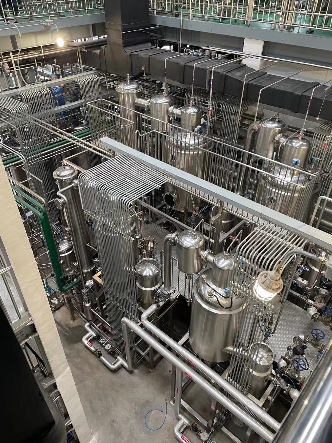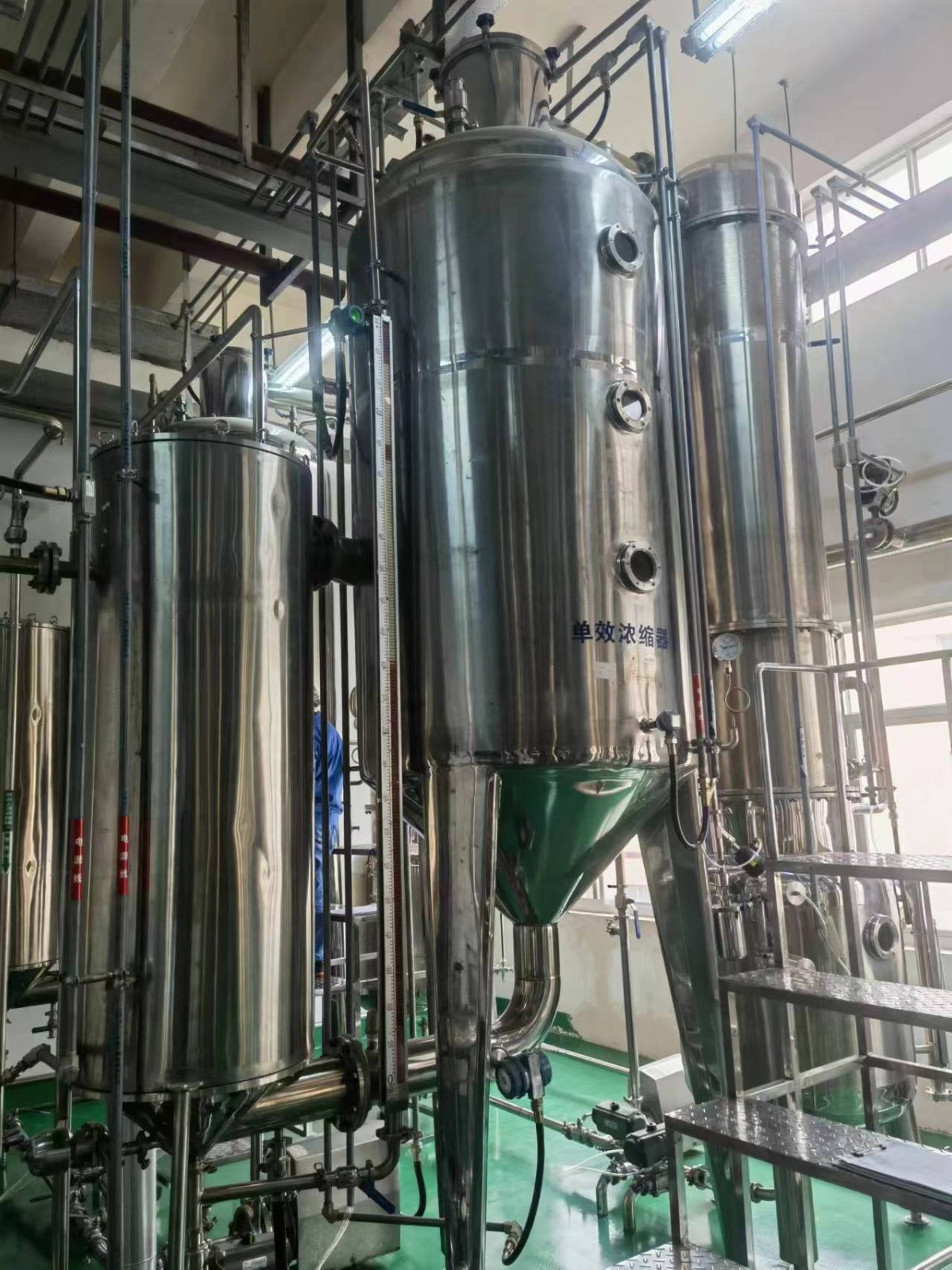 各效加熱器、各效分離器、冷凝器(混合式或表面式)、進(jìn)料泵、出料泵、真空泵、冷凝水泵、操作平臺、電器控制柜、液位自控系統(tǒng)及閥門管路等。